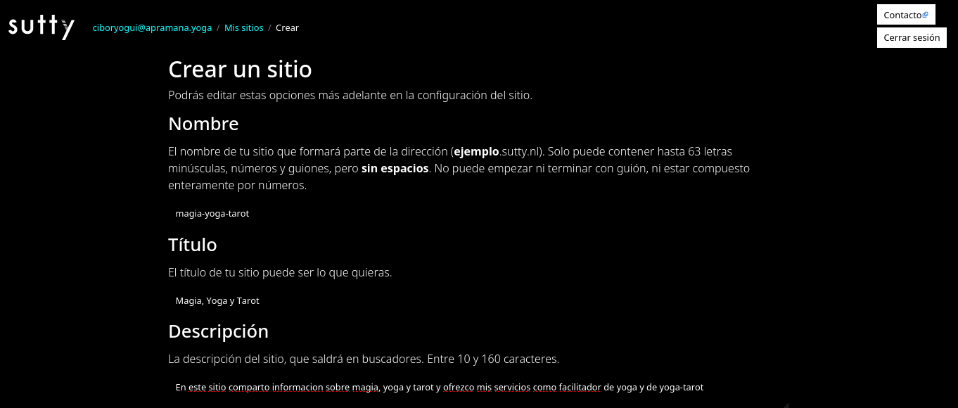 Choose the name of your site, which will have the format “SITENAME.sutty.nl”. It needs to be unique and have no special characters.