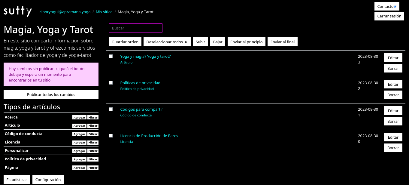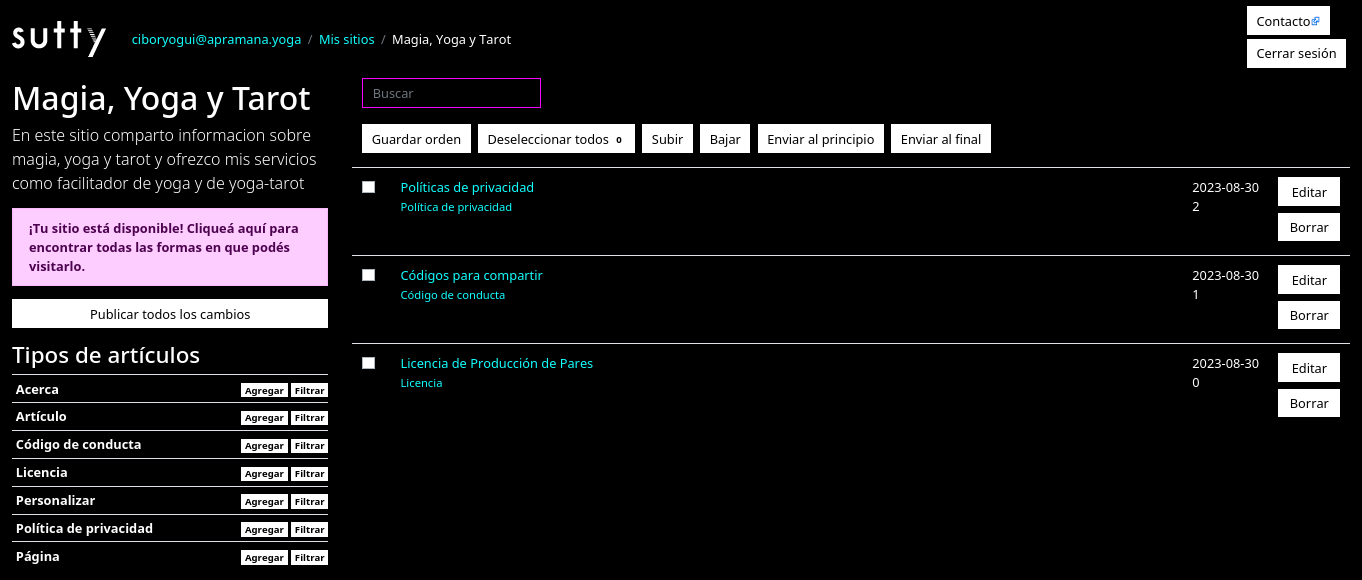 Yay! Your site’s ready. You’ll now be redirected to your site panel, where you’ll have the list of available posts in the center. Don’t worry if you find three articles there already! These are the ones that Sutty adds by default and will appear in the footer; they contain information about the site’s Privacy Policy, Code of Conduct and Licensing Agreements. You can leave them as they are, edit them or even delete them.