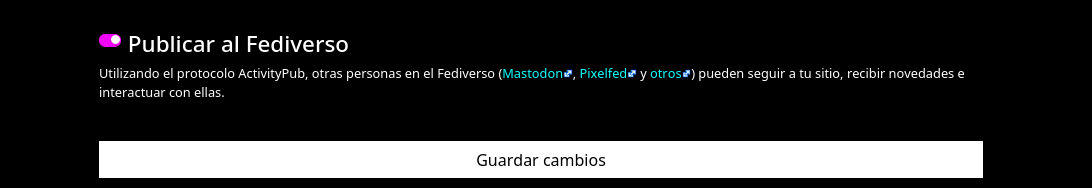 To do this, you must go to the Configuration option, on the left side of your panel, inside your site with the Minima design. Remember to scroll down the list until you find the option to Publish to the Fediverse and then, at the bottom, to Save changes.